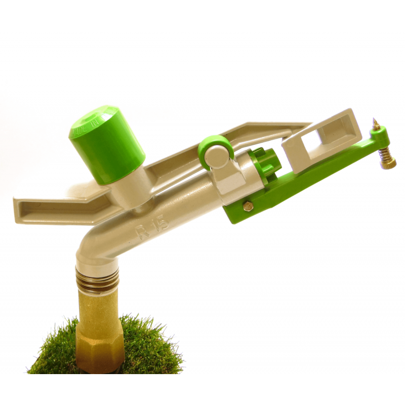 Zraszacz posiada gwint wewnętrzny 1 1/4”. Zraszacz młoteczkowy wykonany jest z dwóch części jedna stanowi aluminiowy korpus w którym osadzone są dysze zraszacza napędowa krótkiego zasięgu i przednia dysza główna zraszacza dalekiego zasięgu.